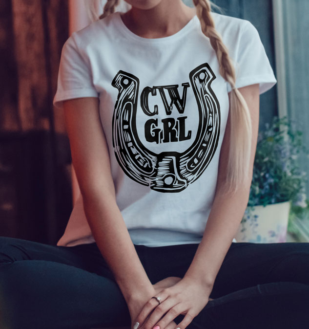 Designed für echt Cowgirls. Geschnitzt und für den Druck aufbereitet. Hochwertiger Siebdruck in schwarz auf super bequemen FAIRTRADE T-Shirt. 100% Baumwolle.